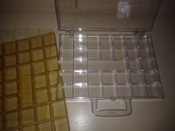Plastic storage container with handle. Also contains two inner compartments. Smaller compartments for beads, nails and other small items. One in the structure also another that is removable with a lid. Very sturdy. Measures approximately 12 in Long, 8 1/2 in wide, 1 1/2 in deep.