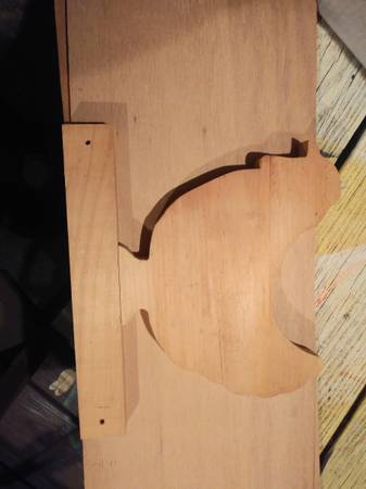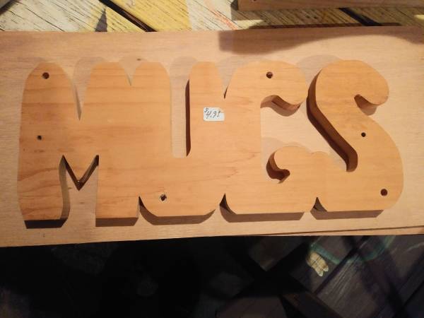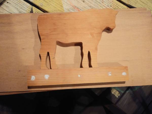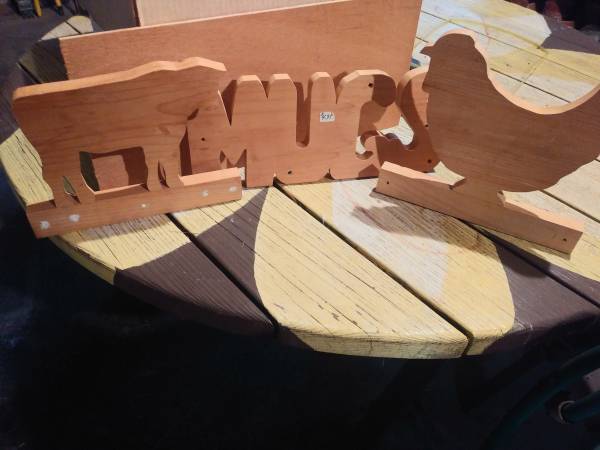 Three individual free-standing wooden cut out pieces. One rooster, one cow, 1 mugs spelled out piece. All three for $8. Ready for painting or staining.