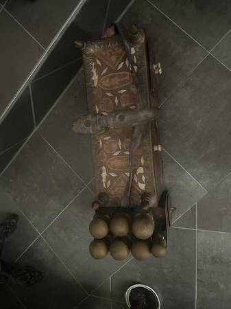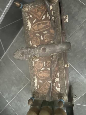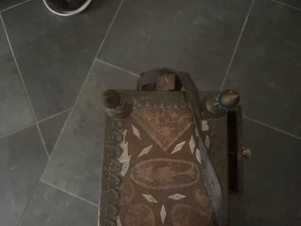 Antique Shoeshine Stand Turkish, late 19th/early 20th century, is made of stamped brass and gorgeous inlaid designs. It has one drawer, leather strap (worn with age) and one brass shoe holder in the middle. There are eight original brass-capped glass bottles of various sizes. Very good vintage condition and a real conversation piece.