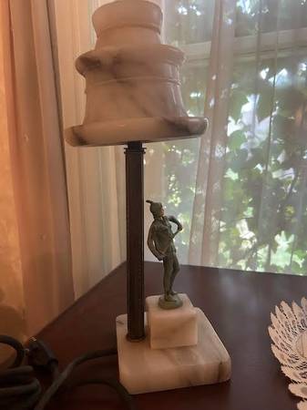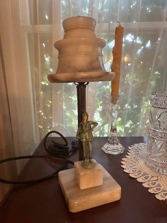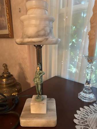 It's difficult to say definitively whether Joseph B. Hirsch, the founder of J.B. Hirsch Co., signed his lamps, but here is an incised stamp (signature mark) (last pic) that may be J. RHUL., an artist who designed for him or attributed to the New York Art Bronze Works (D.A.V NY ART) Hirsch's company from 1907. It's hard to make out. Shows very little wear commensurate with age. Wiring looks original.Very unique & a converstaion piece.