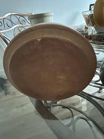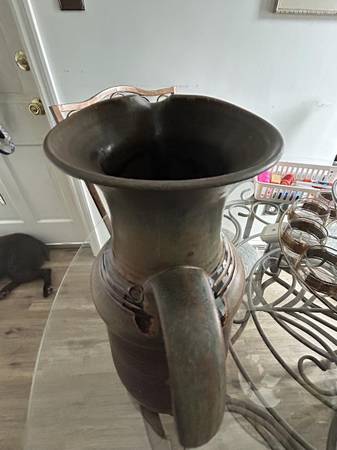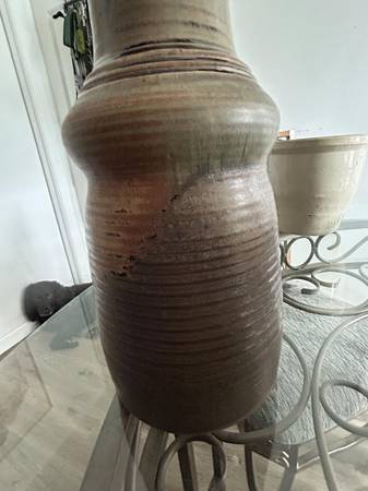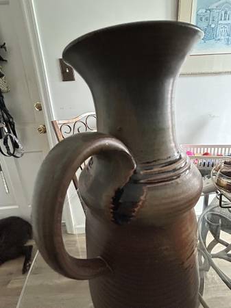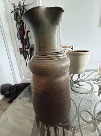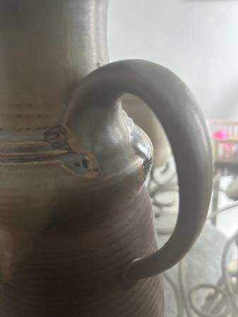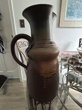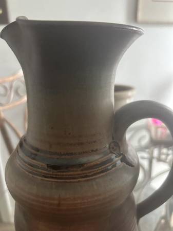 Gallucci Signed Ceramic Handled Pitcher featuring a ridged boy with a single handle and a flared spout. The surface displays an earthy glaze with tones of brown & green, complemented by unique horizontal striations Signature is inscribed on base. 12" tall