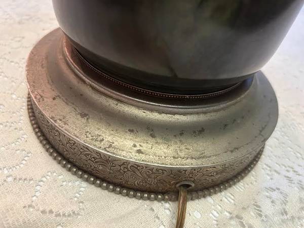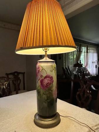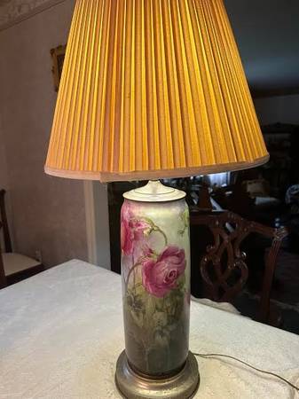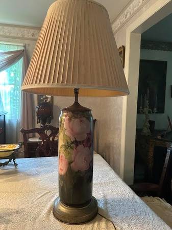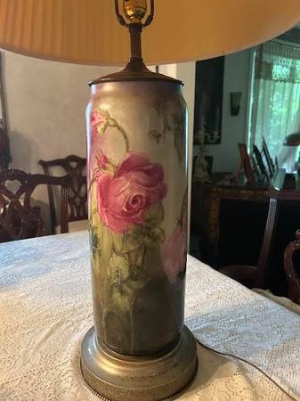 A Huge Elegant Porcelain Table Lamp that features beautifully hand painted shades of pink, red, and greens. The the cylindrical porcelain is set on an etched brass or silver plate 9" diameter pedestal. The entire lamp is 36 " tall from the base to the brass finial and the porcelain alone is 17" tall. The rich colors and delicate brushstrokes add warmth and sophistication, making it a refined accent piece in vintage and traditional décor. The lamp is in overall great vintage condition; the porcelain is pristine. There may be signs of wear consistent with age on the base. Not sure of its s history, but it appears to be antique Vienna Austria Porcelain. It's just gorgeous!