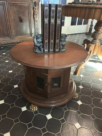 MCM Lovers. This is a rare Kittinger table with storage on the bottom. It is make of Oak and features gold (brass) paws.