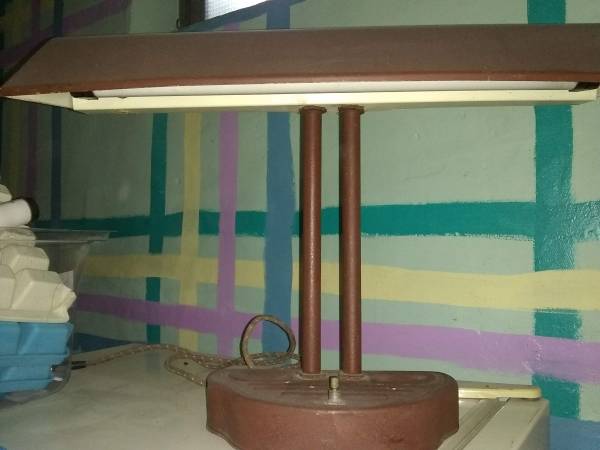 Metal, steel industrial lamp all original, even the working bulb, for sale. 14 inches high and 19 1/2 inches wide.