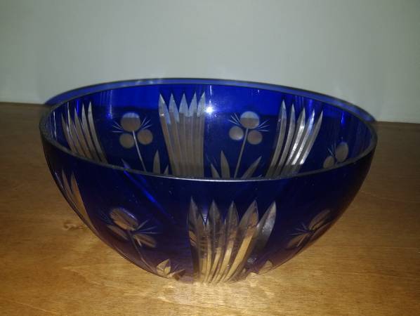 Beautiful blue and clear cut glass bowl. Measuring approximately 7 1/2 inch diameter 4 in height. Perfect for serving or display. In beautifully perfect condition. Floral cutouts are perfect. Solid...