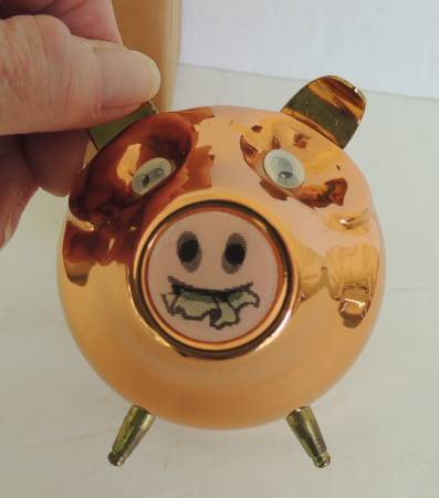 All shiny copper, with contrasting feet, tail and ears (possibly in brass?) ** Holographic eyes and snout. Changes from pigs to an open smiley mouth, then green bills in the mouth, then a smile with a red tongue.