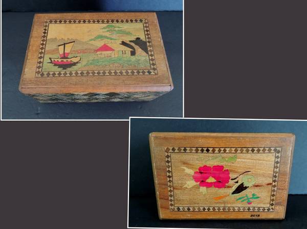 Two sided: featuring Mount Fuji design with marquetry inlay on one side, a flower on the other.