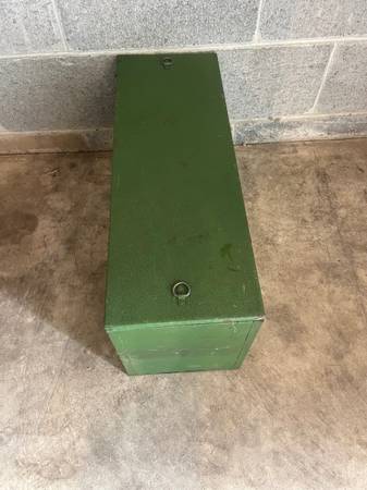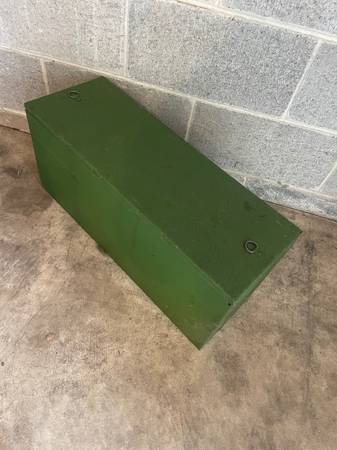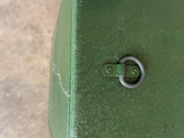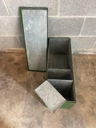 An older cooler. It's made of metal. It was possibly from an Industrial Setting or from a boat. It has a smaller metal box with a lid that fits into to it. There's handles for carrying or moving it. It was most recently used as room decor.