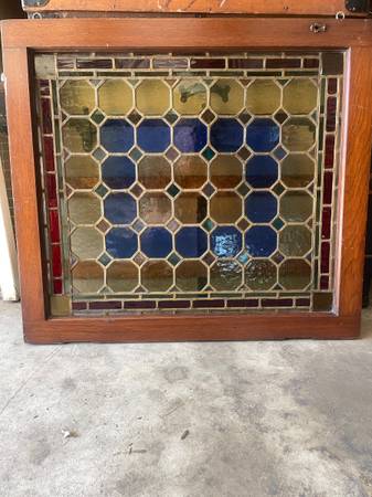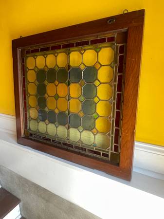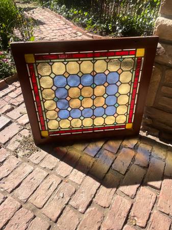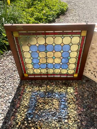 An eye-catching Antique Stained Glass Window. It has many different colors, including the rare color red. There are 2 slight cracks-