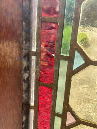 1 in a red pane and 1 in a blue pane, as well as a slight bulge in a lower section. See photos. This is a nice old window, possibly from a church. What's rare is both sides of the wood frame have never been painted. I bought it to hang inside of a window, but it's a