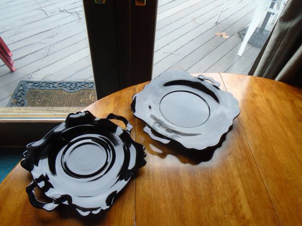 Two beautiful pieces of black amethyst serving plates. 1930s Almost 100 yrs old. Large plate is 11 3/4", Small plate is 10 3/4". These two pieces have been together as a pair since the 1930s. Some minor fine scratches, typical for age. Selling these two wonderful pieces together for $59. (Shipping available for an extra charge)