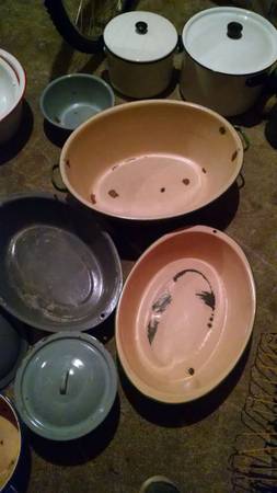 A COLLECTION OF OLD ENAMELWARE TO DECORATE YOUR HOME. PICK SOME OR ALL FOR VARIOUS PRICES. HIGHEST PRICE IS $25. for the largest ones, $7-10 for smaller ones.