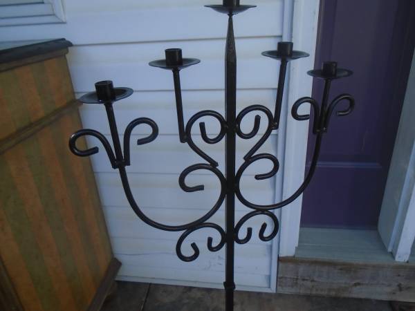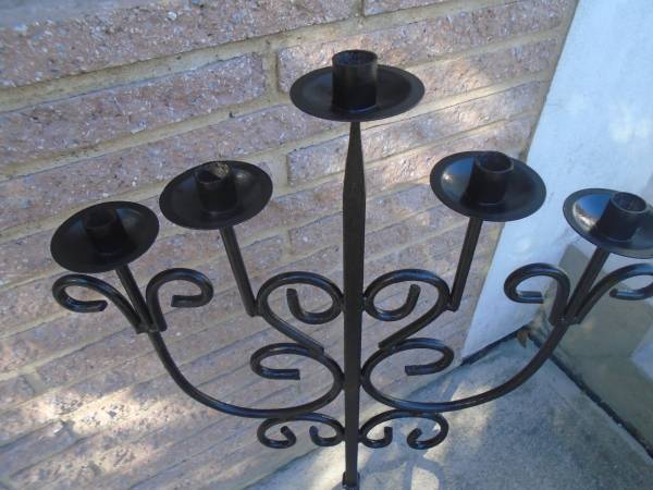 This candelabra is a rustic, wrought iron, European made piece. It has a medieval look. 5 tiers, solid iron. Stands 37" Tall x 20" Wide with a 7" x 7" base. Ready for your mancave, porch or patio enhancement.
