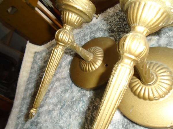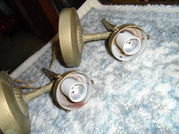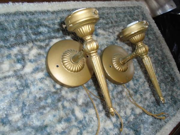 Matching pair of 1950s-60s. Ornate pattern. Tin and cast iron construction. Good wiring. Use any globes. 5" base plate 3.75" screw mount spacing. 8.5" overall height. Sold as a pair. $75 Call and...