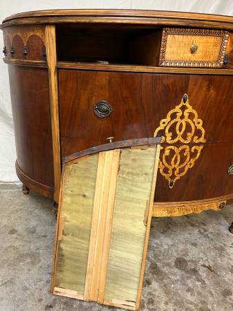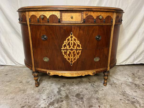 “Under the big top!” This was one of the most unique pieces we have had the privilege to work on. We’ve been lovingly referring to it as the carnival piece - it truly is a statement. Antique vintage half circle lowboy dresser. Features 5 dovetail drawers on wooden drawer slides. Drawers work great! Whole piece was sanded down and two coats of tung oil were applied to make the wood grain and intricate details truly pop. Unique and different - perfect for the person who wants anything but cookie cutter!