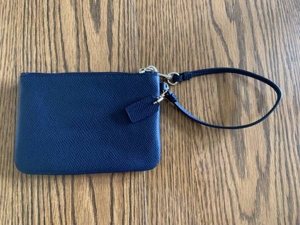 I have for sale a Like New Coach Navy Blue Wristlet Wallet. The Wristlet is in Perfect Condition and comes from a Pet and Smoke Free Home. It measures 6” Wide x 4 1/2” Tall. $20