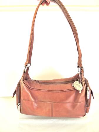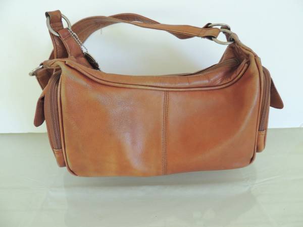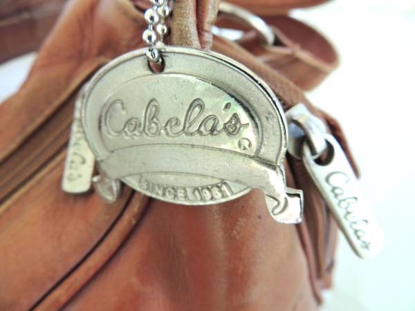 Here is a Cabela's Genuine Columbia Leather Tan Purse shoulder bag with metal Cabela’s medallion and original hang tags.