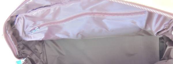Double Zipper pulls (one still has protective coating on, insider zipper pocket, double leather handles, 5 metal feet and a long shoulder strap.