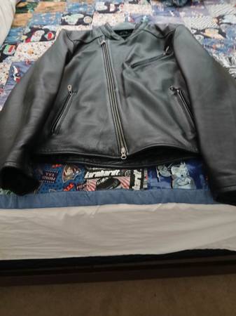 Harley davidson in black and top pocket and orange v on top back of coat and harley davidson motorcycles on bottom back. .Removable liner and pads for elbows and shoulders.