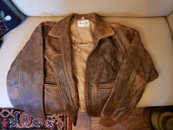 Used like NEW condition. Scully bomber jacket in an unusual brown leather. This a a very unique jacket and look. Chest size = 22"