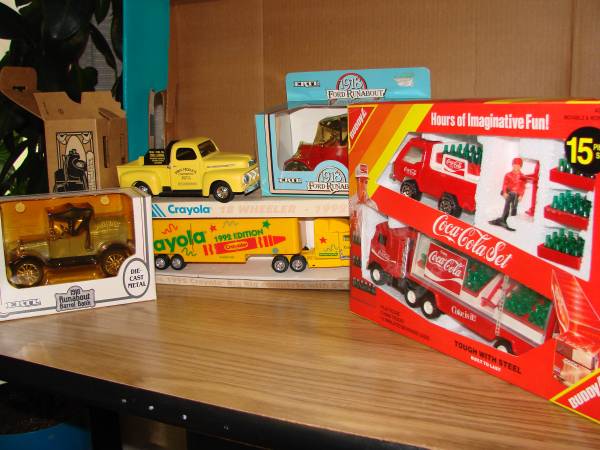 11 Vintage Ertl, Crayola, Buddy L Coke, Hartoy and Golden trucks