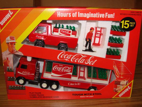 9. Buddy L Brute Vehicle 15-piece Coca-Cola Mack truck set. This 15-piece Coca-Cola set has 2 steel trucks, 2 hand trucks, 10 beverage cases with bottles and one man. The semi-truck and the delivery truck are Macks. The set is new the original box is a little worn. Asking $40.