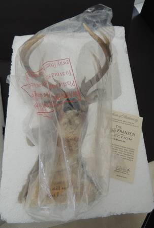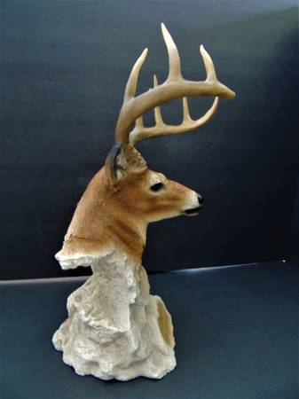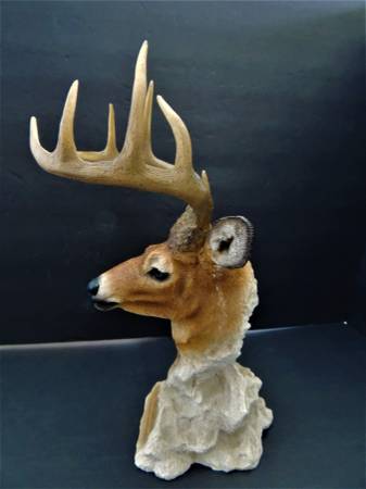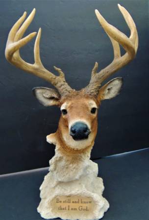Here is a vintage, complete with original box and COA, a breathtakingly beautiful collectible buck deer head sculpture with exquisite detail, including the antlers. This stunning accent figurine is something not only a wildlife collector can admire, but even a hunter, nature lover, Christian and more ... can appreciate. Inspirational, it is adorned with scripture, too! This is solid and has weight to it, not hollow. Check out the true-to-life, authentic and distinctive features of this buck – so often not captured by other artists. This is a hand-painted resin reproduction that preserves the artists' original sculpture. It depicts the inspiration that wildlife and faith has given the artist, the spiritual world living in harmony with nature.