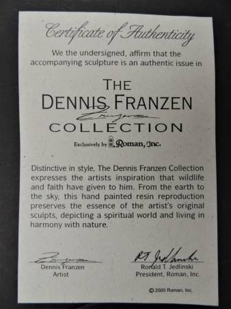 --Franzen's sculpting career talent began years ago with pieces made for Roman Inc. who has classified the works as "The Dennis Franzen Collection", and has expanded since with contracts with the "Bradford Exchange" and the Minnesota based "WildWings" for wildlife-themed sculptures. His work ranges from the realistic to the abstract and has several bronze sculptures featured in various art galleries throughout the U.S.