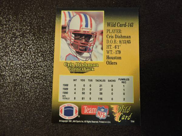 Houston Oilers trading cards, all in great condition. 1992 AAA "Wild Card" Card #86 (1 Available) $1 1991 Pacific Card #170 (1 Available) $1.25 1991 AAA "Wild Card" Card #143 (8 Available) $2 each...