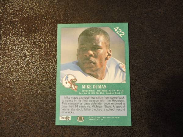 Houston Oilers trading cards, all in great condition. 1991 Fleer Card #422 Mike Dumas (3 Available) 1991 Pacific Card #535 Mike Dumas (1 Available) 1991 Upper Deck Card #3 Mike Dumas (1 Available)...