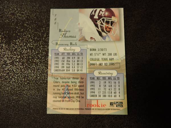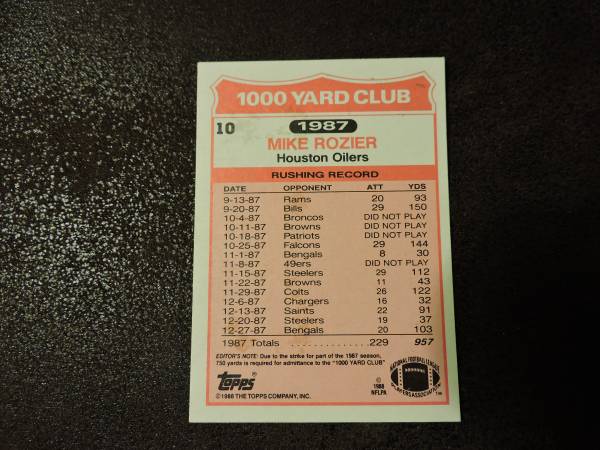 Houston Oilers trading cards, all in great condition. 1995 Upper Deck Card #343 Lamar Lathon (1 Available) 1988 Topps 1000 Yard Club Card #10 Mike Rozier (2 Available) 1988 Topps Card #104 Mike...