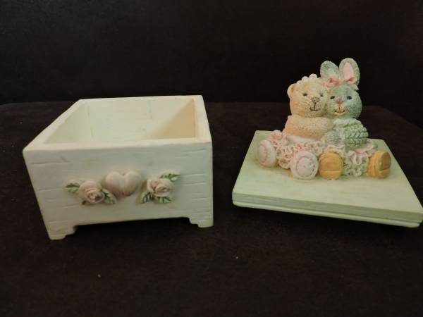 1996 FIGI BX-SN-102 trinket box is titled "Friends Forever Box". Perfect for your vanity or bathroom shelf. Made of a resin material. You can put your jewelry in it while you are showering or keep special items inside on your vanity. Measures about 4" high and 2.5" square. There is no damage of any kind on this piece. Perfect as a gift too!
