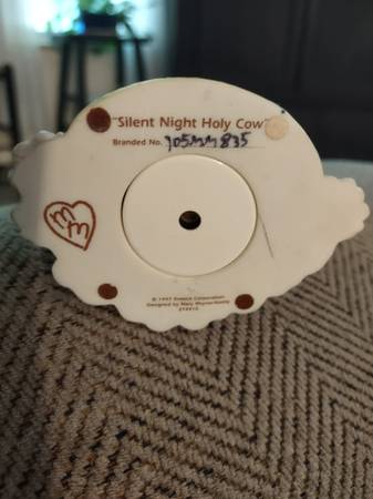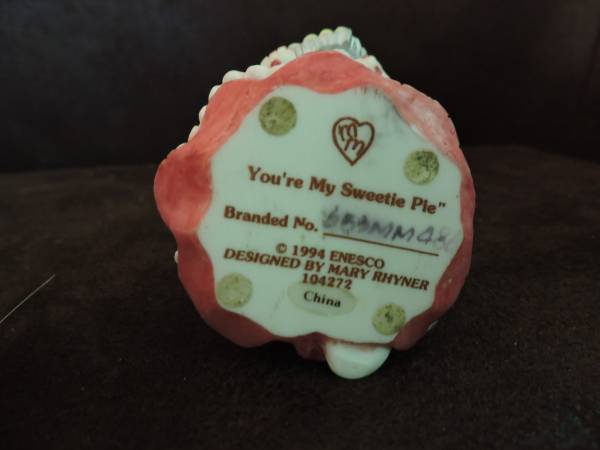 Made by Enesco Corporation and designed by Mary Rhyner, each of these is "Branded" with a serial number on the bottom. The one on the left is "Silent Night Holy Cow" and the one on the right is "You're My Sweetie Pie". They are in perfect condition with no chips or other damage. So cute for your curio cabinet or to decorate a child's room.