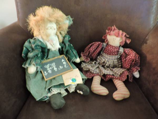 This is a vintage set of 2 country display dolls. The one on the left has "Debbie" written on the back of her neck. This one still has the tag that says "Teacher's Pet" and has a miniature chalk board hanging by a rope from her arms. The tag has printed "Reg-No PA/OHIO #5205" however I cannot locate another one like it online. There is no maker markings. The second one has no identification tags. These are for display only, for a child's room or if you collect vintage country fabric dolls, you might have to have these!! There is no damage on either of these dolls. The one on the left measures 16" tall and the one on the right measures 12" tall.