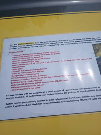 1987 Monte Carlo Aero Coup Rare SS with T-Tops - See Photo for details. Vehicle is in good condition. Contact for seriously inquires only. Or trades of equal value .