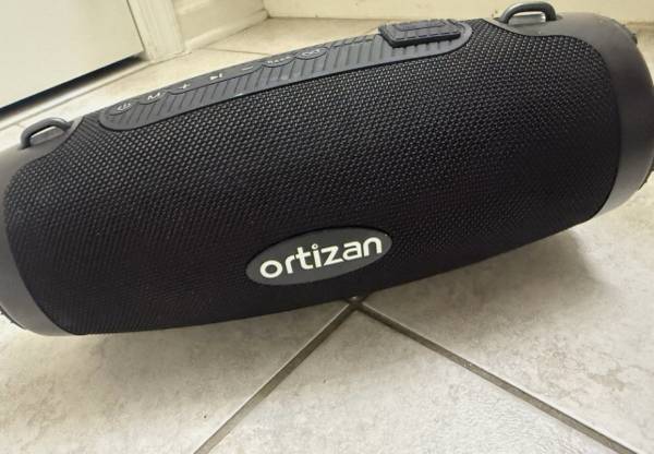 The Ortizan 100W Wireless Speaker is a portable speaker system with a sleek oval shape, designed for powerful sound quality. With a high RMS power of 100W, this speaker delivers clear and impactful audio. Its waterproof feature makes it perfect for use in various environments, while the wireless connectivity allows for easy streaming of music. The 14400 battery capacity ensures long-lasting power, 4 to 5 hours of play, and the durable plastic material ensures longevity. Ideal for those looking for a reliable and powerful speaker system for their on-the-go audio needs. Comes with charging cable and shoulder strap. Only used a few times almost new.