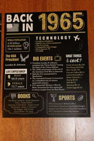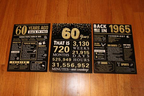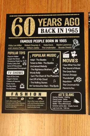 - Take a look back in 1965; these 60 years ago signs make a great conversation starter. Featuring historical facts from 1965, attract more families or guests to join in on the fun. These signs are made of thick cardboard, surface laminated; featuring gold and white print on glossy black. You can use these signs in various ways such as using adhesive stickers (included) to decorate a wall or door. You could also frame them to display as a centerpiece or use them on your party tables.