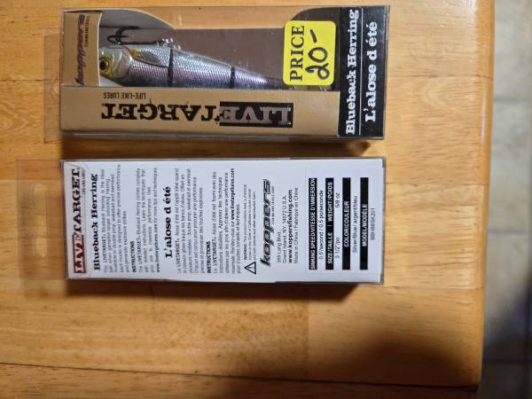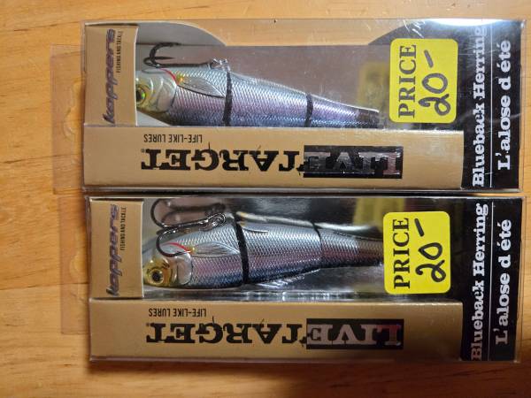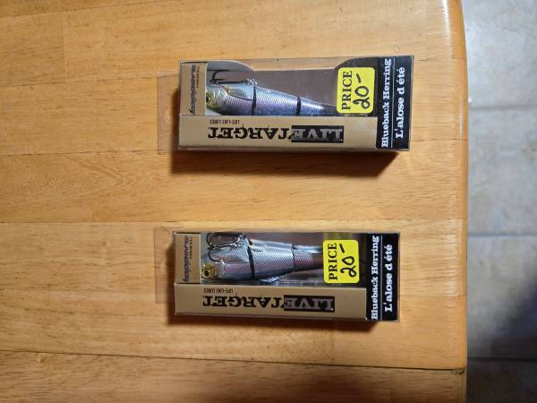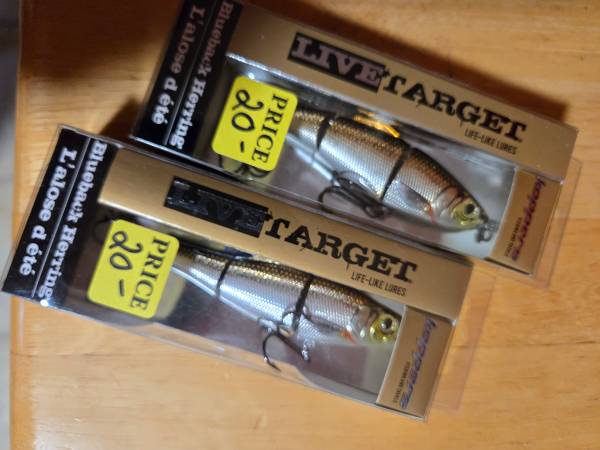 Live target 3 1/2" jointed blueback herring fishing lures which are discontinued.