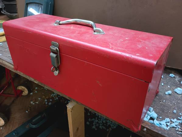 sabre saw blades, 1/2" drive ratchet, Craftsman, Ridgid, teflon tape, spade bits, spade bit extension, open end wrench, boxed end wrench, ball peen, driver bits.