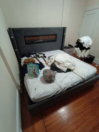 King bed and mattress. Grey in color. Paid 2100.00 asking 300.00 Sectional w/decor pillows. Grey in color. Paid 1000.00 asking 300.00 White w/Marble grey print Bar Table. Seats three. Asking 100.00...