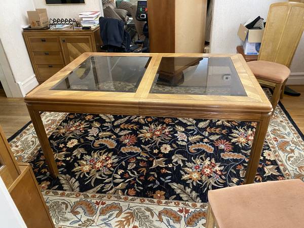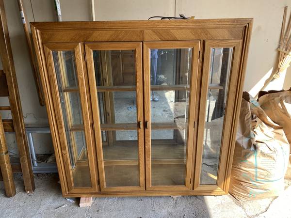 I am selling a complete Oak Dining Room set. It consist of the TABLE and four chairs, a SERVER with two fold open extensions, and a two piece, (base and top) CHINA CLOSET, (or HUTCH).
