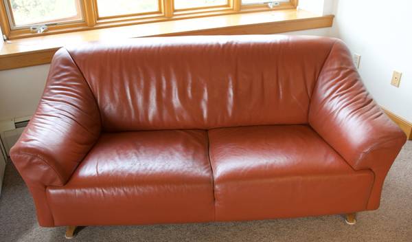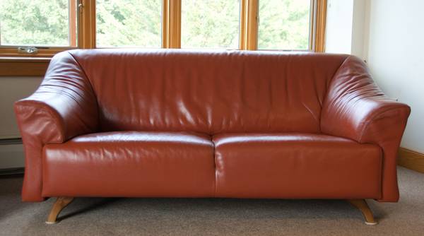Classic Maurice Villency love seat (2005), made in Italy, top quality Italian leather, excellent condition, some wear on seat areas, no tears, rips or repairs.