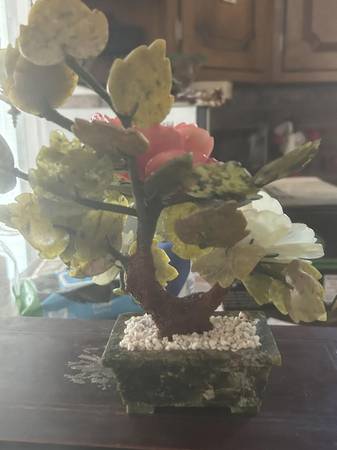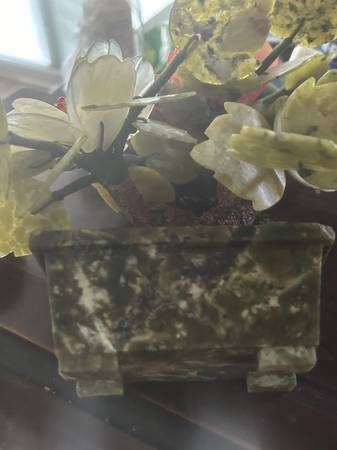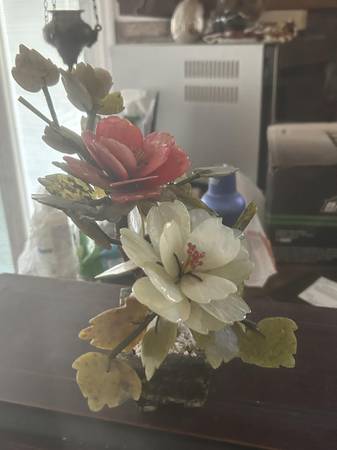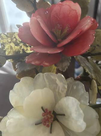 This is covered with carved leaves and peddles in red and green tones, set in a rectangular stone planter and peddles. It measures 10" wide X 9.5" tall X 7 " deep. Notable details include intricate craftsmanship of the flowers. A beautiful addition to any decor. No breaks or cracks.