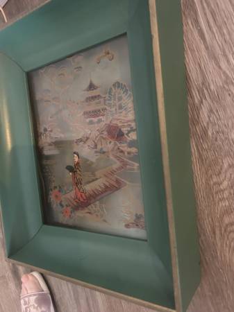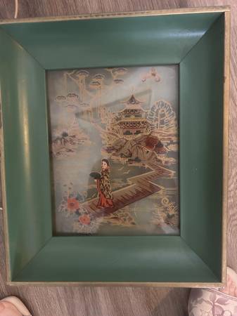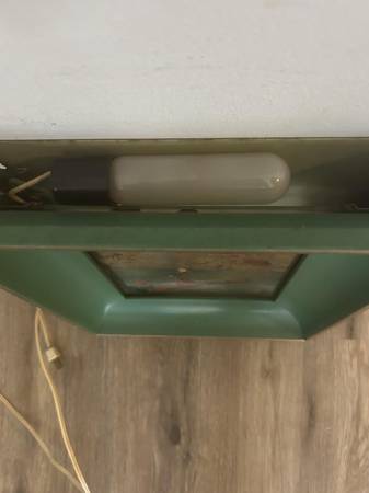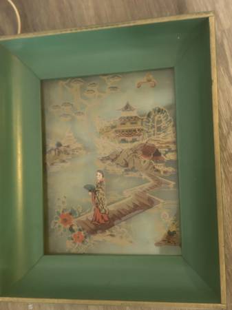 features a green metal exterior with a gold painted accent border.. It has a picture of an Asian woman and scene painted on glass and inside there are lights. The turn switch is located at the bottom of the piece. Fantastic addition to your Mid Century decor, dorm, or nostalgia.It measure 14 5/8" High x 12 1/4 Wide x 3" Deep, ready to hang. Fair to good working condition. some paint loss on frame.