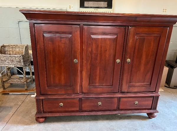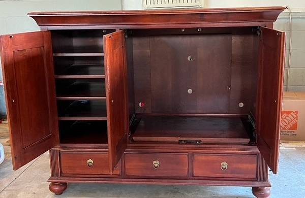 Ethan Allen cabinet purchased for $2700.00 in 2009. Can be used as an armoire or entertainment center. Holds up to a 32” TV, which is perfect for the bedroom. The two doors slide inside when watching TV. The size is 64” wide, 23” deep, and 53” high. Well built and pretty heavy; it is being stored in a garage and will take 2 people to move it.
