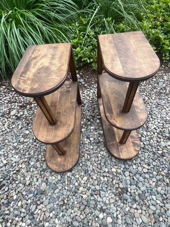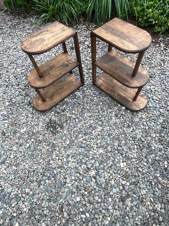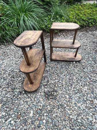 A pair of Antique 3 Tiered Stepped Bookshelf Stands. Art Deco Style. 1940’s Era. They have some wear from age and use. Sturdy and no issues. Nice wood grain patterns. 9 x 21 and 21 1/2 High