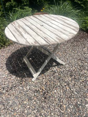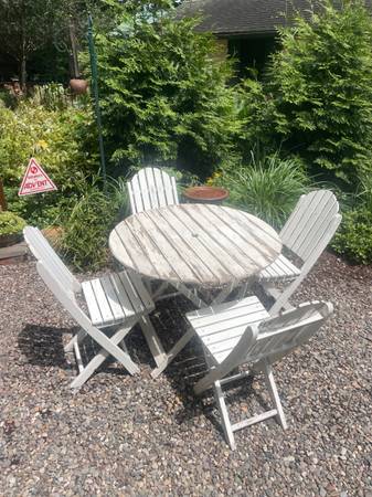 A set of 4 Chairs and a Round Table. All have some wear from age and use. The chairs are very sturdy. Table and Chairs all fold for easy moving or storage. Cash and local pickup. I answer emails...