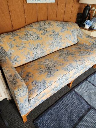 Blue Toile Country Life Scene upholstered Sofa w/wood legs $900. Original yellow/gold fabric in great condition Approx. 67 1/2" length, 32" deep, 35" high NO SCAMS OR SPAMS!