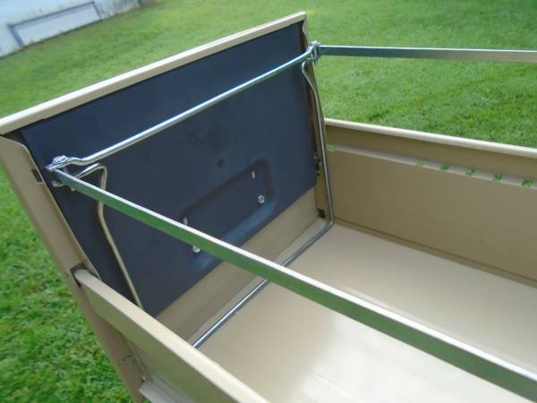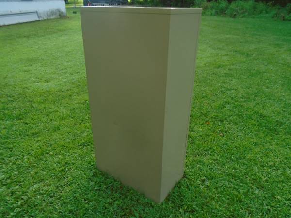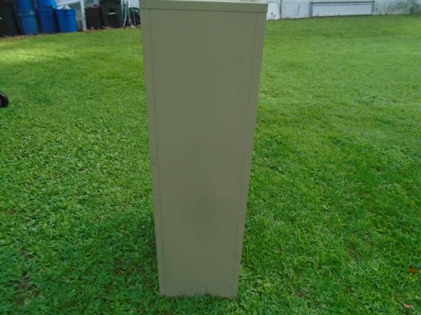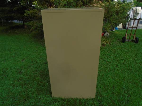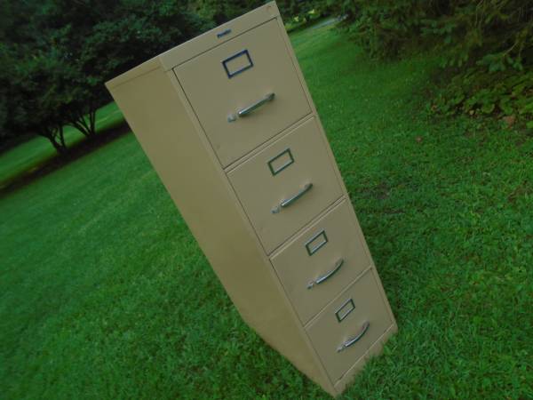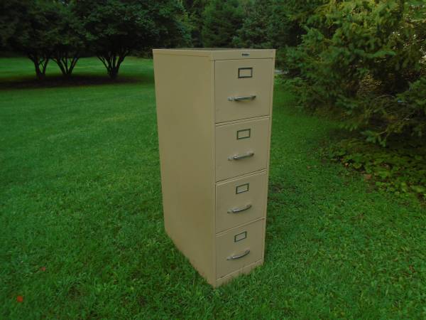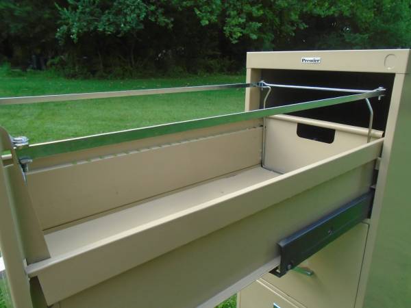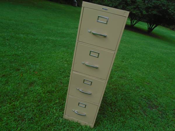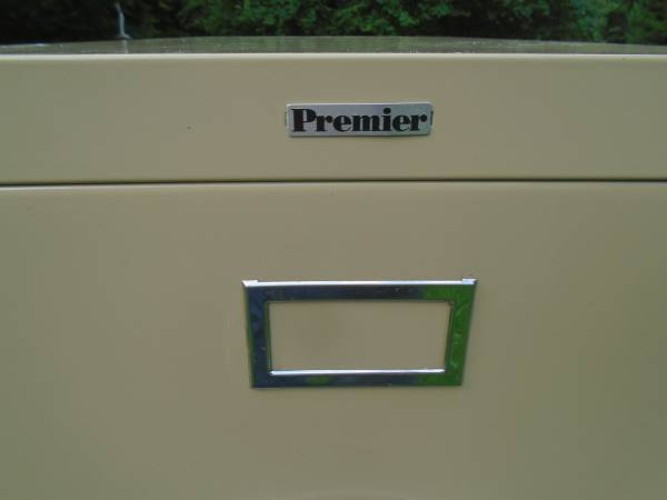 Four drawer tan color file cabinet with high side drawers and file hanging hardware. Made by "Premier" a high quality commercial file cabinet maker. Features strong roller bearing drawer glides for heavy storage and long lasting use. Typically, a new cabinet like this will sell for $450. 52" Tall x 27" Deep/Wide. Offered for only $85.
