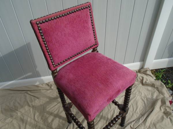 Mfg by Chair Masters in Bronx, NY. This unique and unusual USA made stool features a Rose colored Velour, solid oak turned legs and a European/Spanish flair. Nail head trim. 30" seat height. Overall height is 45" seat is 17" x 17".